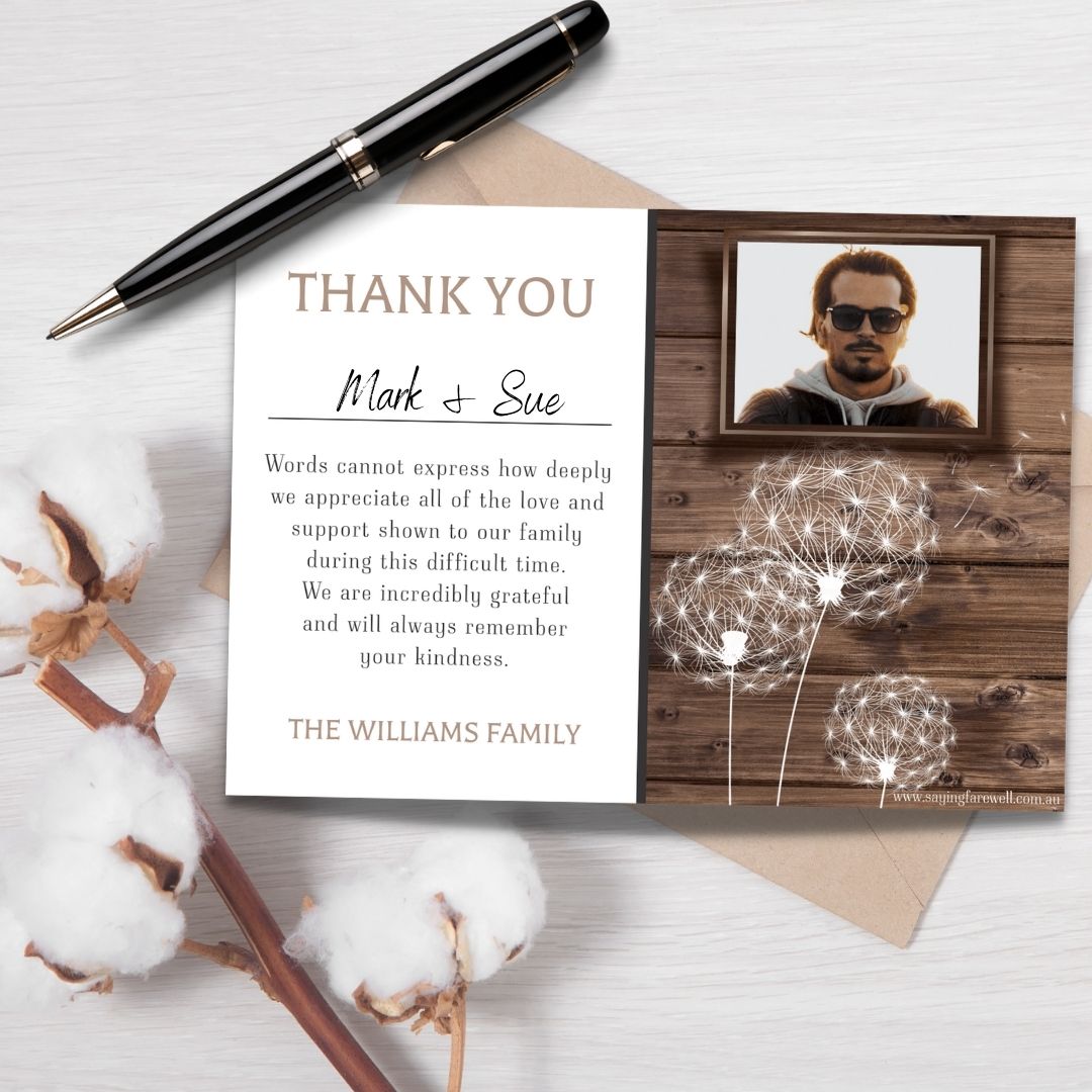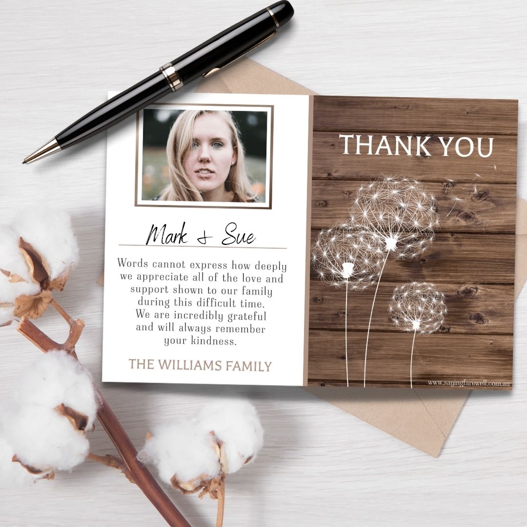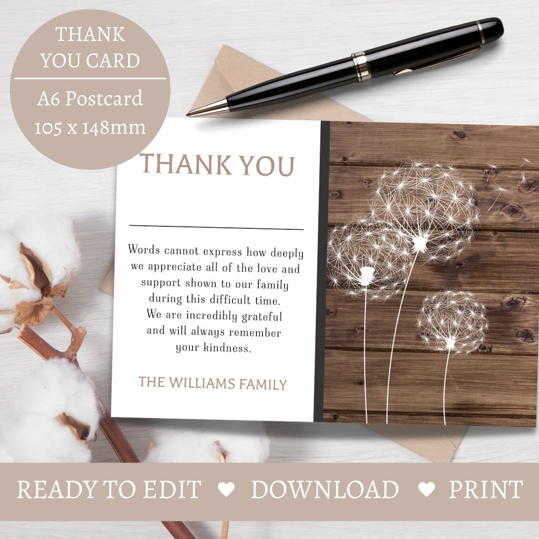 Rustic dandelion thank you card template to show your appreciation with a personal touch. Nothing is more difficult than saying goodbye to a loved one. Support and comfort offered by family and friends can help you through the pain of loss. Edit, download, print and send this beautiful thank you card to show your gratitude in their condolence messages, attendance, and gifts.