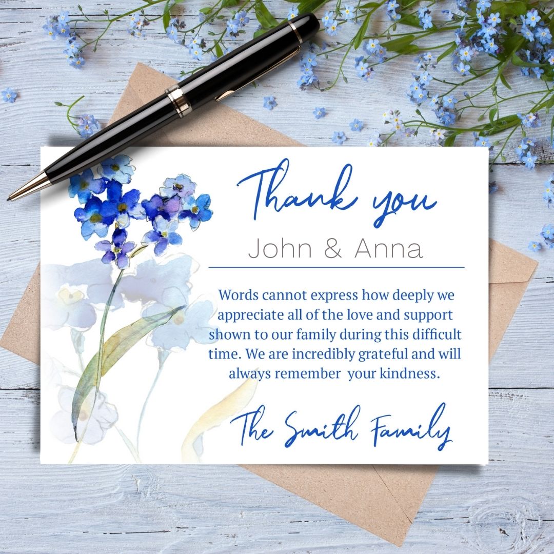 Contemporary forget me not thank you card template to show your appreciation with a personal touch. Nothing is more difficult than saying goodbye to a loved one. Support and comfort offered by family and friends can help you through the pain of loss. Edit, download, print and send this beautiful thank you card to show your gratitude in their condolence messages, attendance, and gifts.